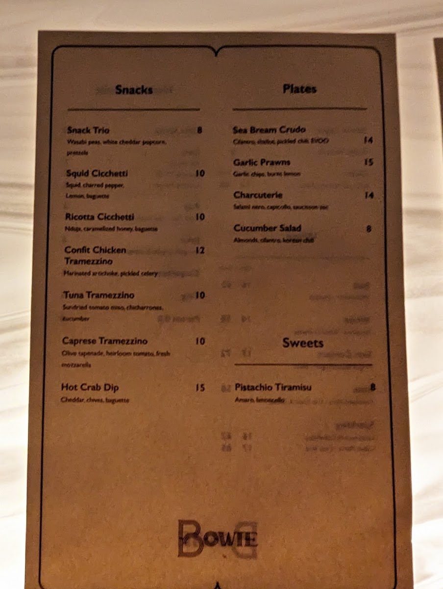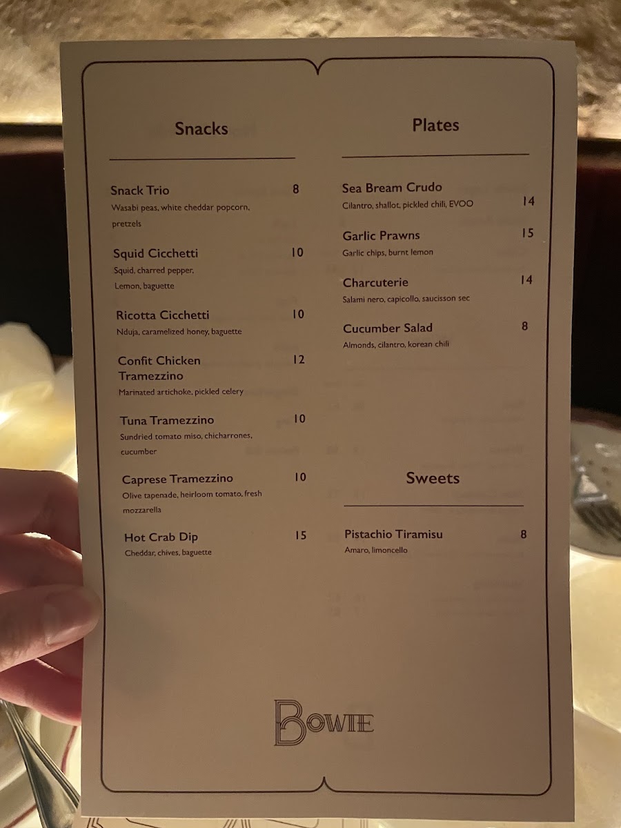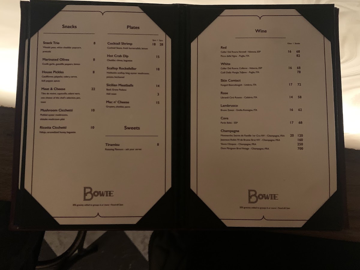 Alongside the drinks, Bowie presents approachable small plates and snacks designed for sharing. Items like the Hot Crab Dip and Mac and Cheese provide comforting, flavorful bites that pair well with the cocktails, enhancing the shared experience central to the space’s vibe. Lighter options such as Marinated Olives and Ricotta Cicchetti offer simple yet refined tastes, suitable for leisurely nibbling between drinks.