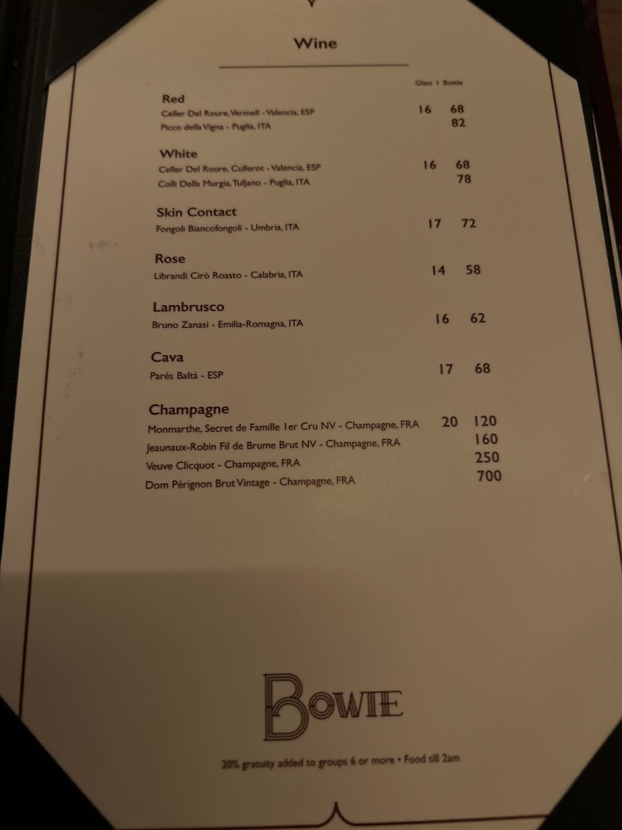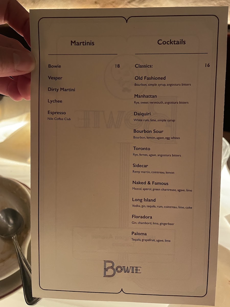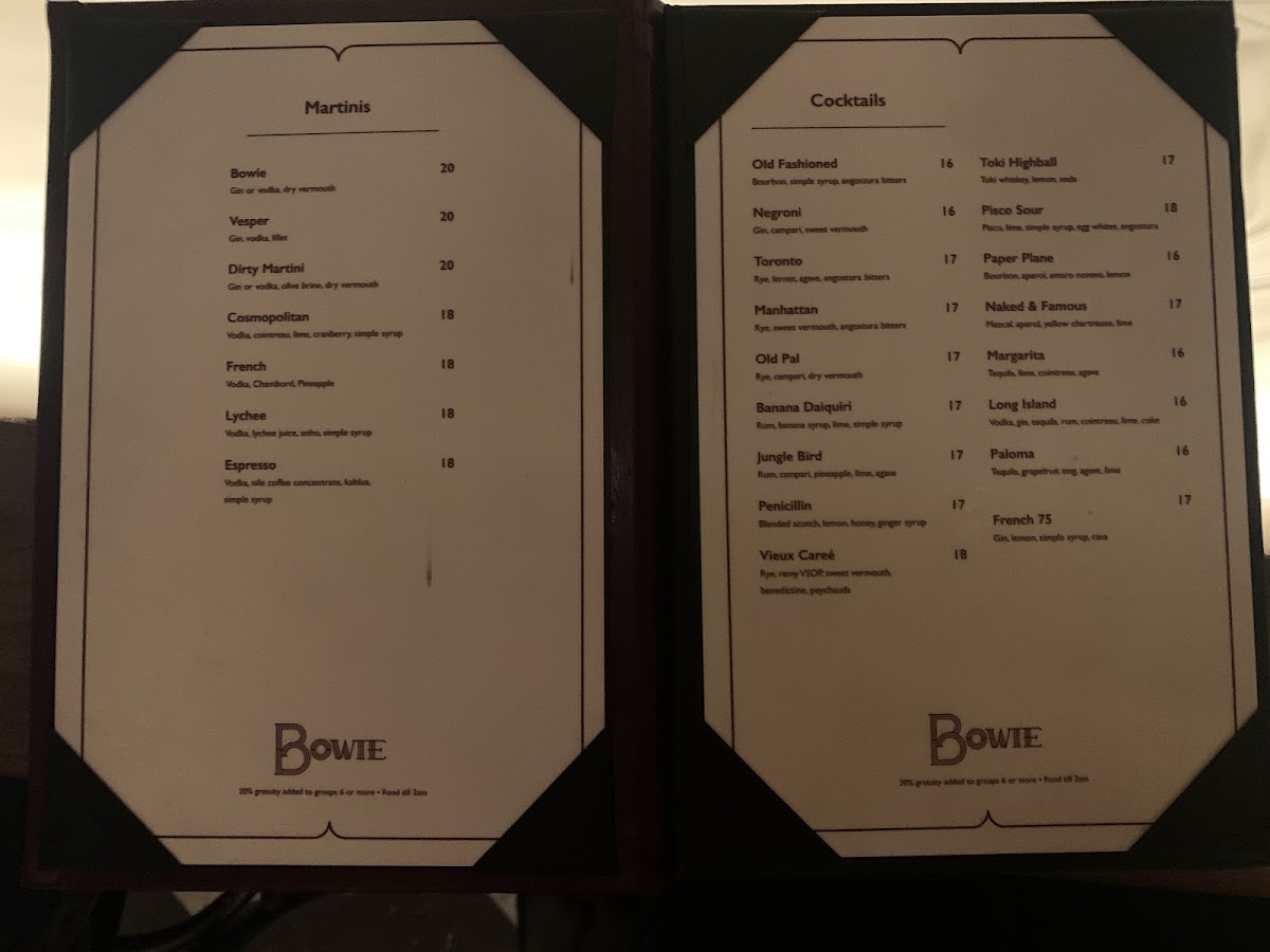 The menu at Bowie offers a thoughtfully curated selection that balances classic and creative, perfect for an intimate evening or a casual night out. It features a range of carefully crafted cocktails, from smooth martinis like the Lychee and Espresso to timeless choices such as the Dirty Martini and Pisco Sour. These drinks complement the bar’s cozy and stylish atmosphere, inviting guests to savor each sip in a relaxed setting.